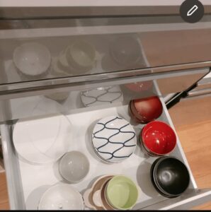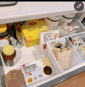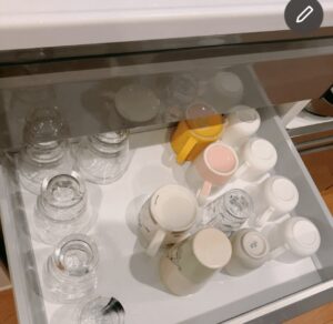 お茶コーナーも仮配置。すぐに薬やお茶が飲める収納引き出しというのは、以前タカラスタンダードさんでシステムキッチンのショールームの収納コーディネートしたときにご提案したものです。