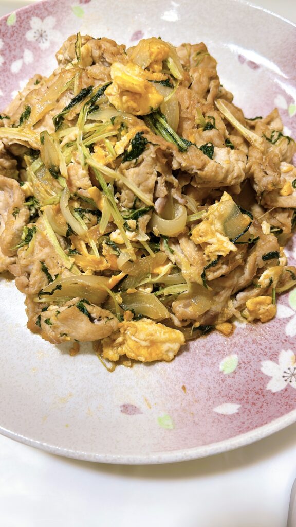 3こっくり豚玉炒め 豚肉と卵と水菜でボリューム満点!まろやかな味わいです。