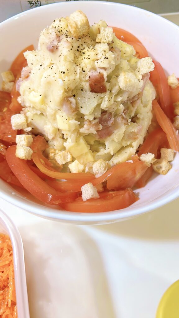 2ごろごろポテトとカリカリベーコンのポテトサラダ 鉄分葉酸入りのベビーチーズも入れて女性に必要な栄養素も摂りましょう。温玉も添えて召し上がれるよう合わせて仕込みしました^^奥様お嬢様からも歓喜の声♡
