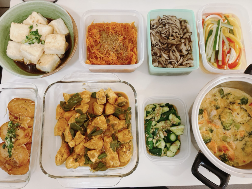 ❷サーモンとブロッコリーのコーンクリーム煮 ❸ヘルシー鶏胸肉とピーマンのタンドリーチキン ❹もっちりさつま揚げのピリ辛マヨ ❺彩りにんじんのしりしり ❻3種のキノコのヘルシーマリネ ❼お酢たっぷりピクルス ❽やみつきたたききゅうり ❾居酒屋風 油少なめ揚げ出し豆腐 材料費¥4800