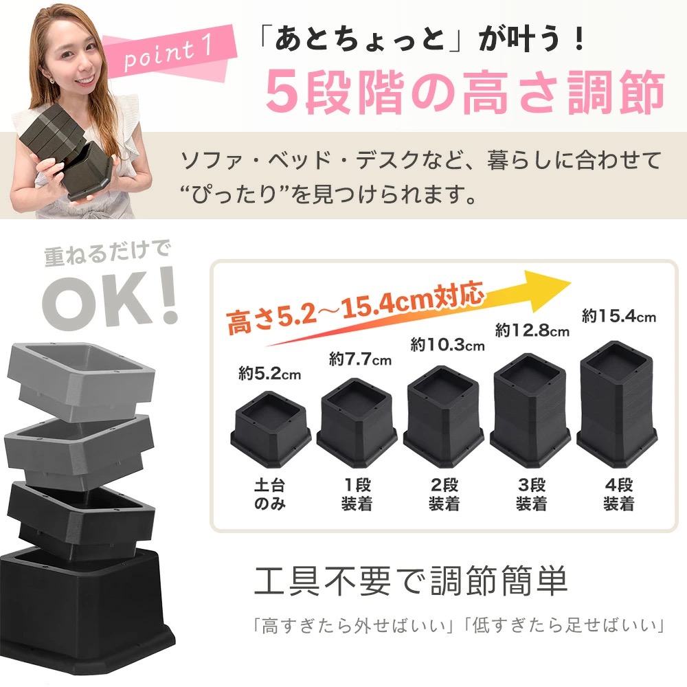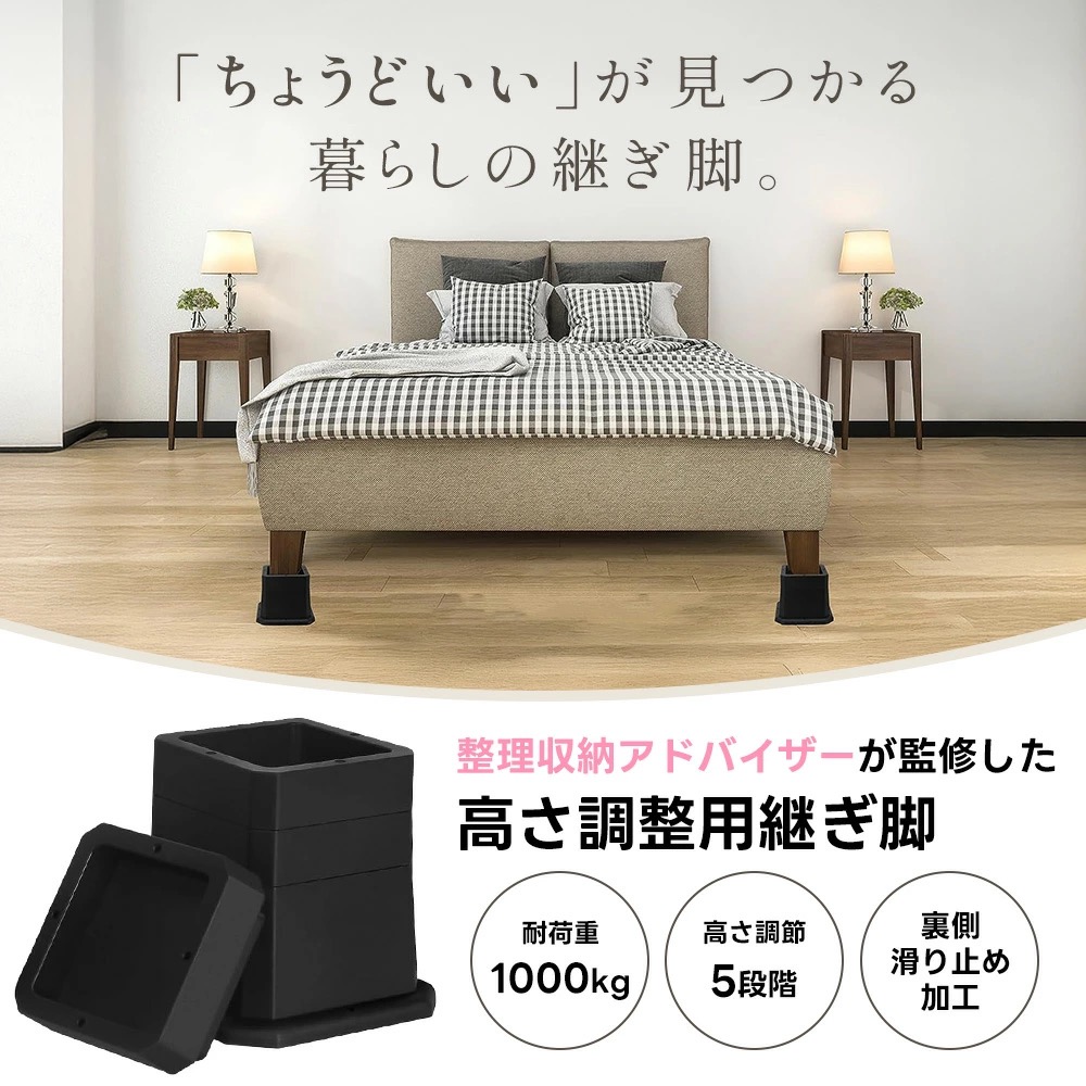 テーブル・ベッド・ソファー・こたつなど様々な家具に対応でき、高さを約5.2cm~約15.4cmまで調整可能で、継ぎ足し・継脚としても使用できます。
