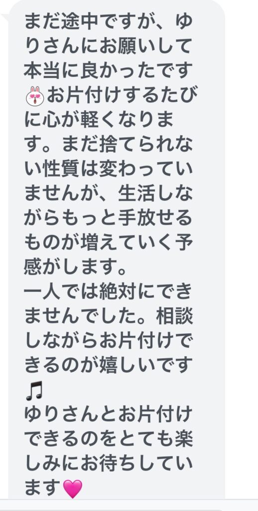 (E -mail:I’m still in the middle of cleaning up, but I’m so glad I asked Yuri for help (like). My heart feels lighter every time I clean up. I still can’t throw things away, but I have a feeling I’ll be able to let go of more things as I go about my life.