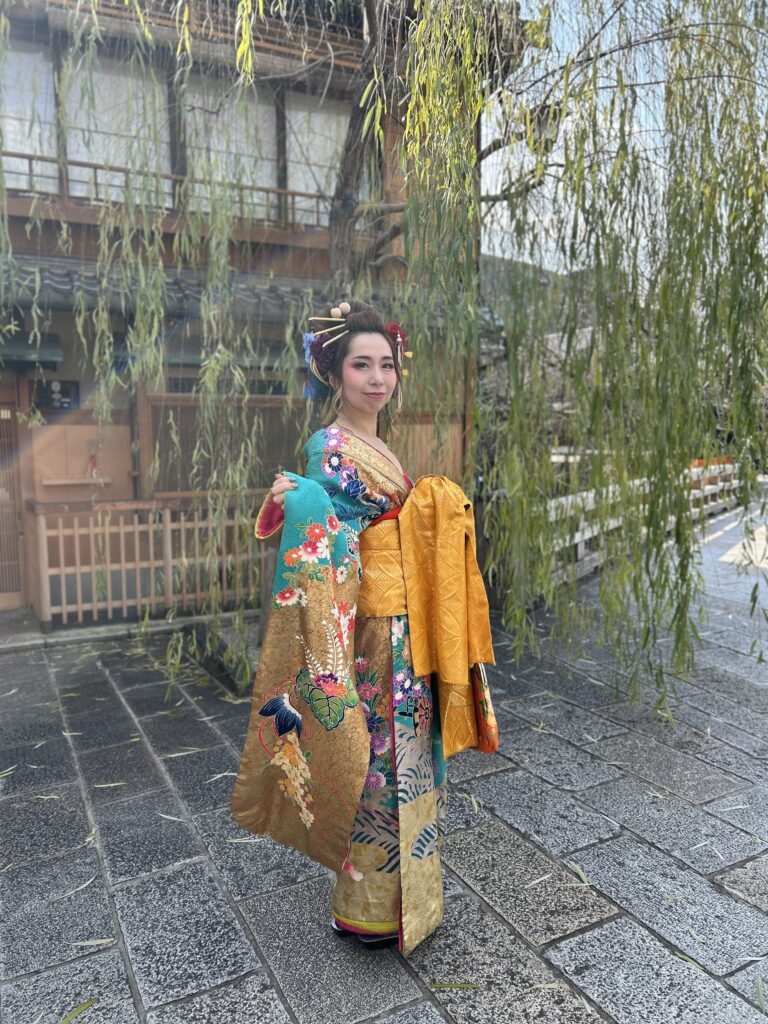 京都のスタジオで、華やかな着物に身を包み、ヘアメイクも着付けも驚くほどスムーズ。