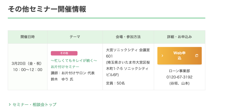 埼玉りそな銀行様×お片づけサロン コラボイベント開催のお知らせ 2026 2/05 〜忙しくてもキレイが続く〜 お片付けセミナー 日時:3月20日(祝日)10:00〜12:00 会場:ソニックシティ大宮 参加費:無料 お申し込みはこちら 「地域のお客様の暮らしの 困りごとを解決するお手伝いをしたい」 というりそな様からのオファーをいただき、 今回のイベントが誕生しました!セミナー後は 無料の整理収納の個別相談も 設ける予定です(人数限定) 。春に向けてお部屋を整え、 さらに暮らしを快適に していきましょう! 埼玉りそな銀行様HP セミナーはこちら イベント お知らせ よかったらシェアしてね! URLをコピーする URLをコピーしました! お問合せは下記からお願いします。※原則72時間以内にご返信いたします お問合せフォーム(24時間) LINE(24時間) LINE公式アカウントの詳しいご案内はこちら 関連記事 冬期休業のお知らせとご挨拶 2025年12月22日 【ラジオ聞き逃し配信】11月放送のHome ,Sweet,Homeです 2025年12月10日 監修したお掃除グッズがついに発売されました! 2025年11月20日 【新年に】家計管理手帳の販売開始です! 2025年10月22日 【比企地区】⑤子育てフォーラム 参加者様のご感想 2025年10月18日 テーブル周りをすっきり片付けたいあなたに♩ 2025年10月15日 バッグハンガー「Ringy」のご紹介です♩ 2025年10月15日 カバンや小物収納に便利な収納アイテムができました! 2025年10月15日